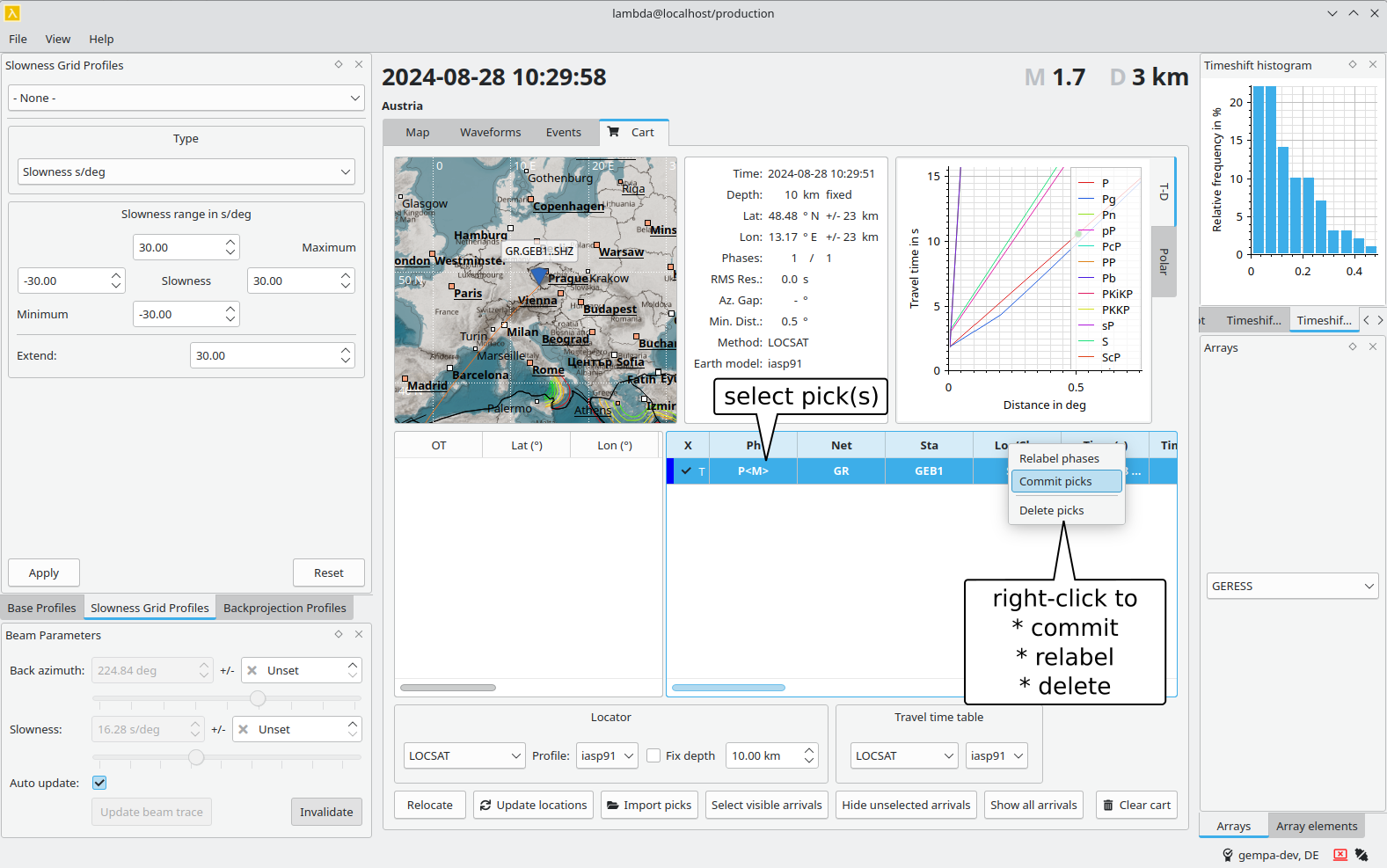 You may interactively pick phase arrival times on single 1C or 3C stations. The arrival times may be added to the cart together with previously determined backazimuth and slowness.