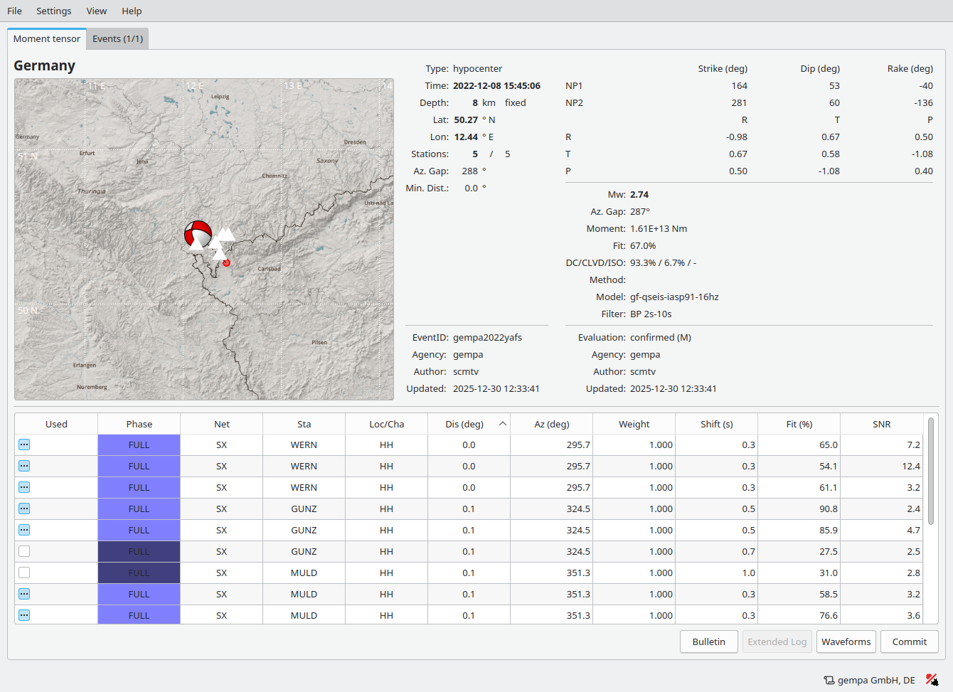 While the MT packages generally ships with Green’s functions supporting observation of large (M>5) events inverting waveforms of lower-magnitude events for moment tensors is supported as well by scmtv and scautomt. Since inversion for moment tensors of such events is generally challenging a few requirement must be met: