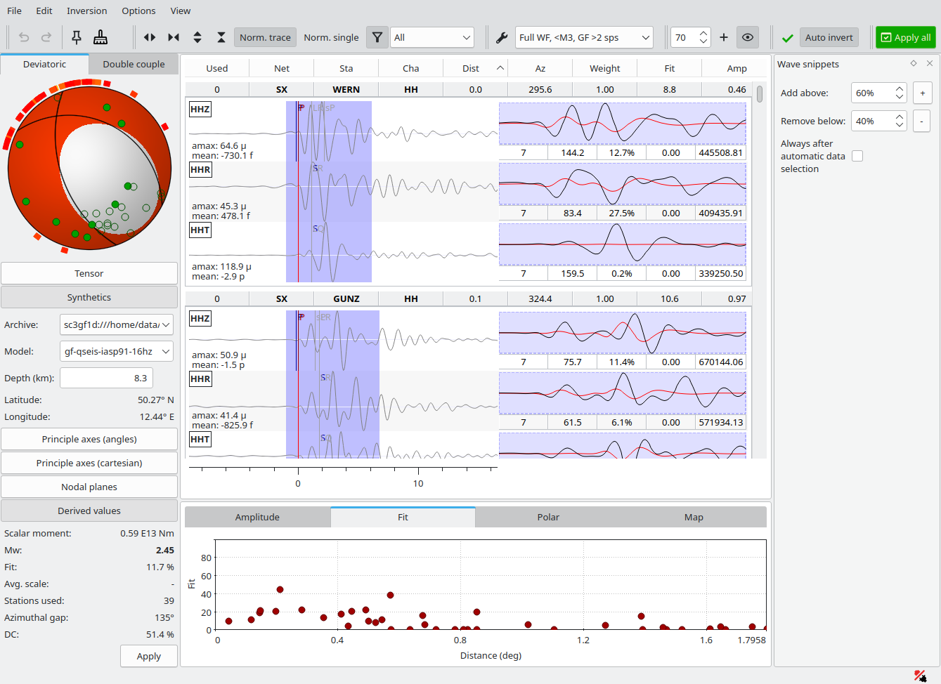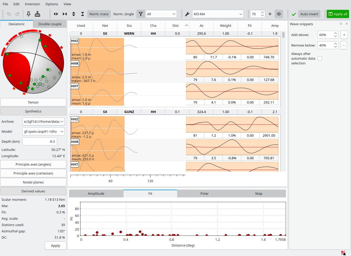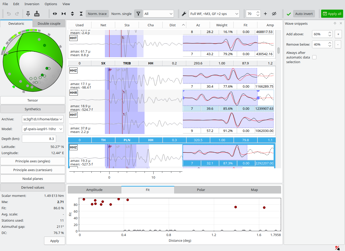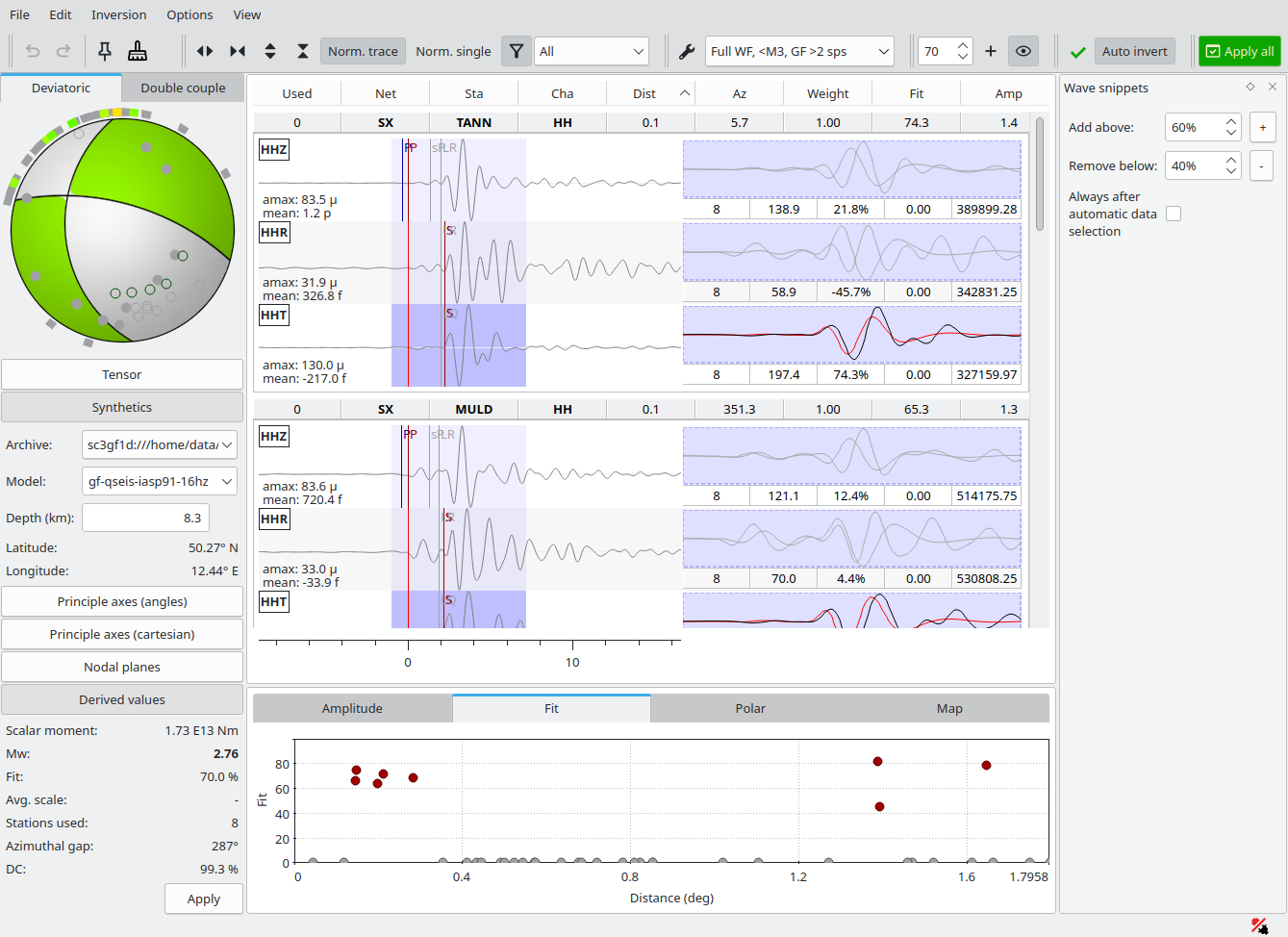 Final solution after shifting and trimming data. More snippets, previously with low Fit could be re-activated and matched contributing to a stable solution with high Fit and DC (double-couple) percentage. The final Mw is 2.7.¶