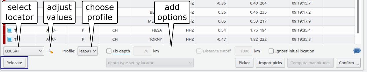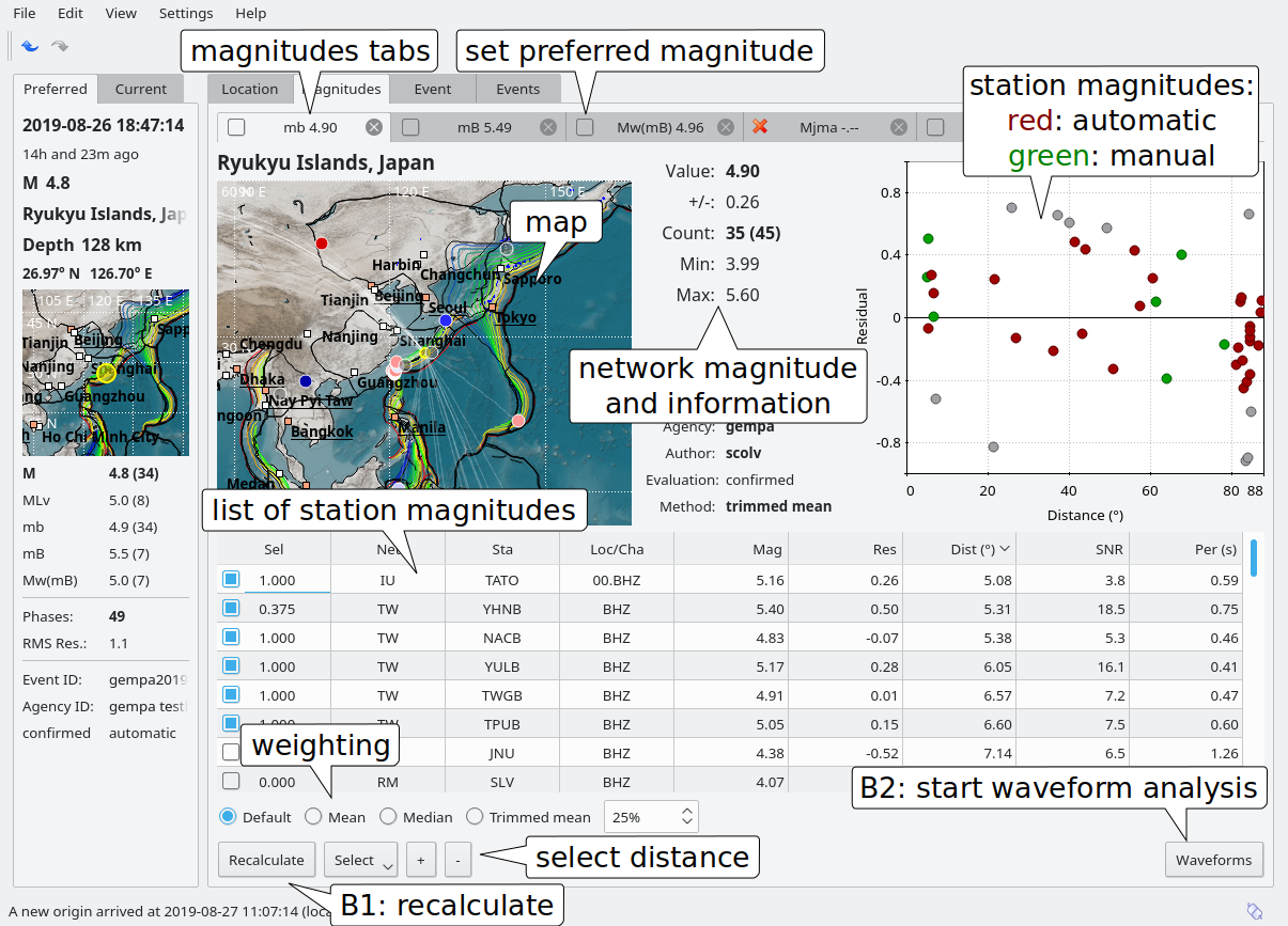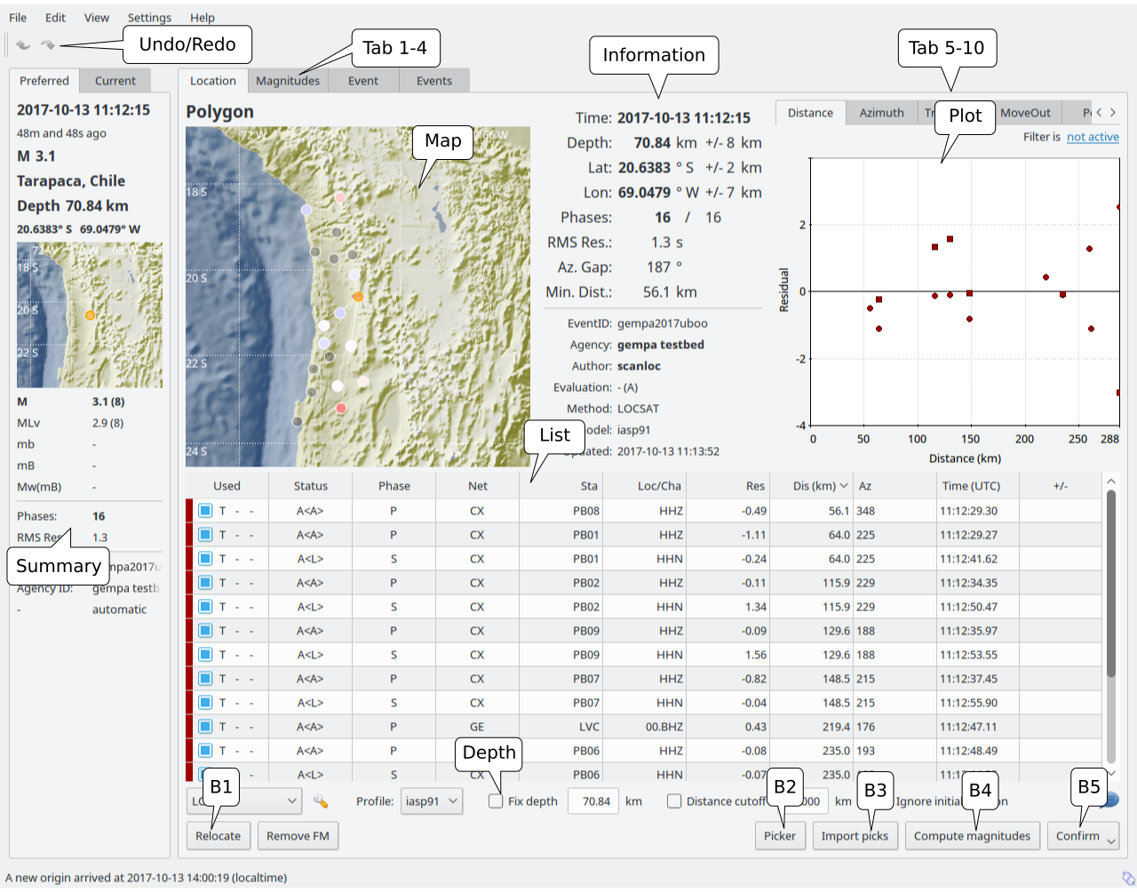 (Redo/Undo) Switch to last/next location result (Tab 1-4) Location/Magnitude/Event/Events tab (Map) map with the event location, associated stations, the color coded residuals (red-positive, blue-negative) and ray paths (Information) Origin information including time, epicentre, depth, number of used and available phases, RMS, azimuthal gap and minimum station distance (List) Table of associated arrivals (phases) containing stream information and phase information (Tab 5-10) Arrival residual plots against distance and azimuth (linear and polar) in a separate tab (Plot) Arrival residual plot (distance over residual in seconds) (Depth) Checkbox to fix to a defined depth (B1) Relocate with the given arrival information (B2) Open Manual Picker (B3) Import picks of other automatic origins belonging to the same event (B4) Compute magnitudes (B5) Commit origin (Summary) all information of the preferred origin of the loaded event