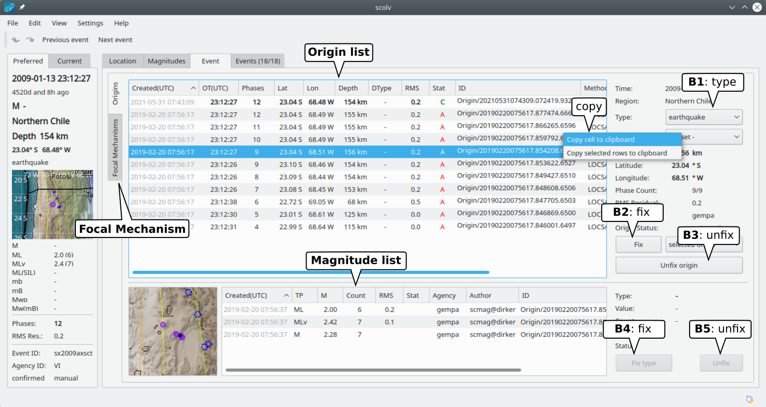 scolv is the main interactive tool to revise or review origin and event information. It thus provides the entire functionality to analyze earthquake parameters: