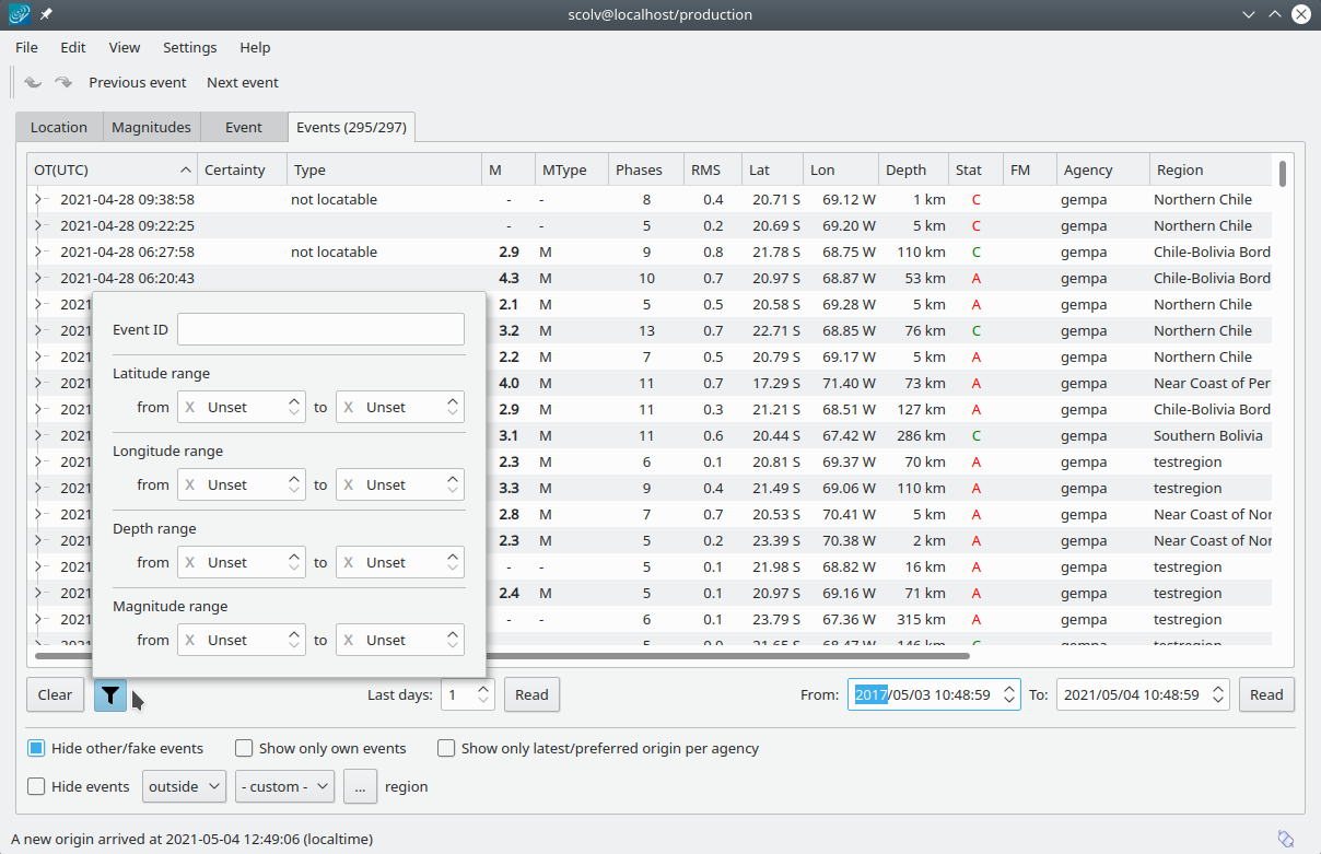 Connected to the messaging where all event and station inventory parameters are received from the messaging or the database and updated in real time. New or updated parameters can be commited to the messaging. Simply start scolv without any argument or connect to a specific host providing the messaging, e.g.: