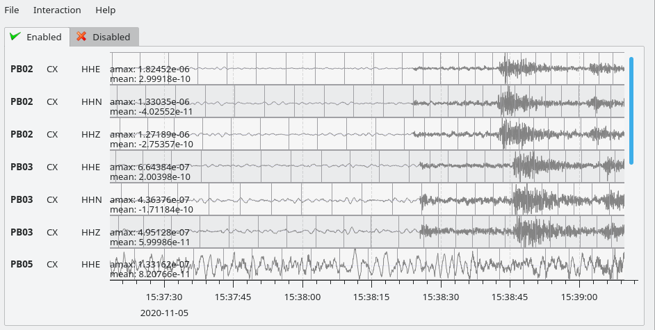 scrttv shows two tabs: the Enabled and the disabled tab (see scrttv overview). Stations listed in the disabled tab are excluded from automatic processing (e.g. phase picking). To move a station from one tab to another just drag and drop the trace to the new tab. An alternative solution is to double click on the trace label to disable a trace. Read the section Waveform Quality Control for the details.