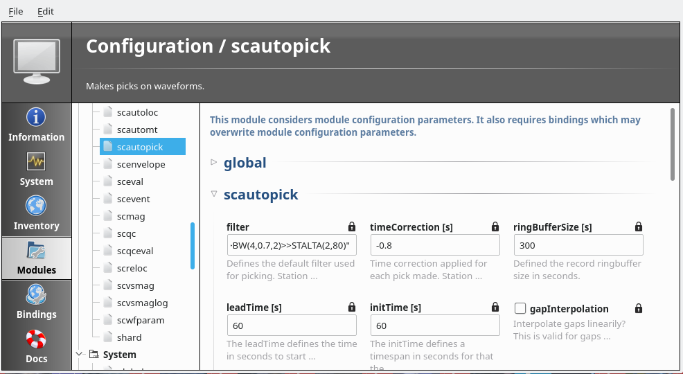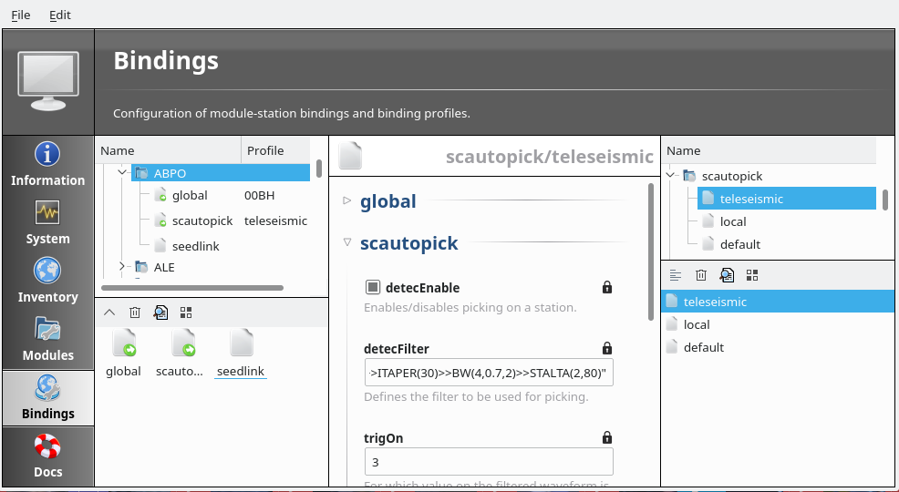 $SEISCOMP_ROOT/etc/key/[module]/station_NET_STAis used only be one station NET.STA.Binding profile parameters: