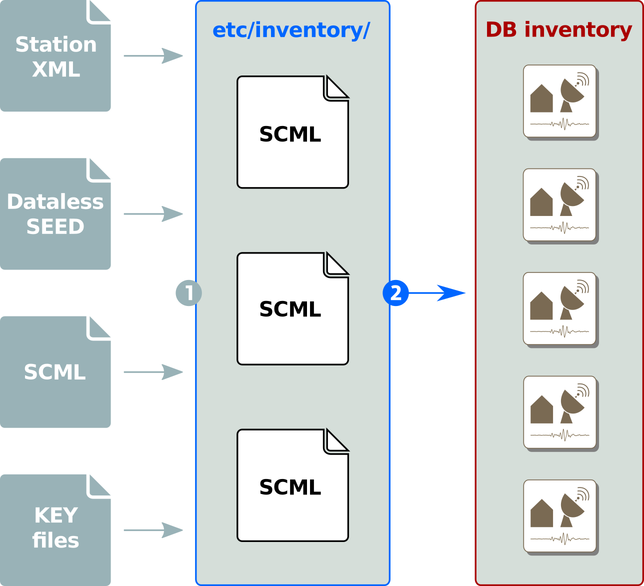 Older version used key files to configure available networks and stations. Because the support of response meta-data was very limited, tools were build to add this functionality. Since the release of Seattle the concept of key files for station meta-data has been completely removed from the system. Now SeisComP only handles station meta-data in its own XML format called SCML. The task of supporting old key files, dataless SEED and other formats has been out-sourced to external applications. The inventory synchronization is a two-stage process: