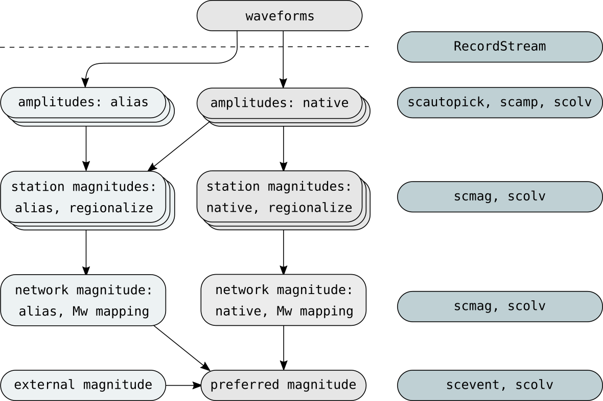Schematic processing flow for computing magnitudes from measured amplitudes including the involved SeisComP modules and interfaces. Multiple network magnitude types can be computed for the same origin. The default processing of native amplitudes and magnitudes in the center can be extended by aliases, regionalization, Mw mapping or external magnitudes.¶
