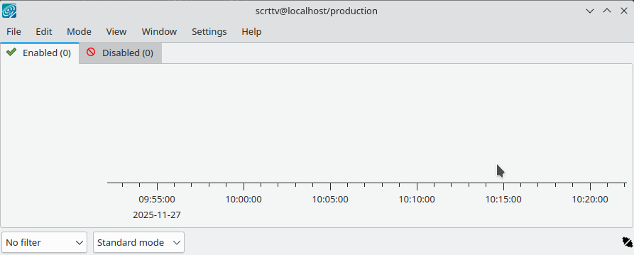 After seeing the SeisComP splash screen, you’ll likely get an error message “Could not read inventory (NULL)”. After a new installation, that’s okay. Click that box away, and you’ll see a screen with “Enabled”, and “Disabled” tabs, and time along bottom axis as in the figure below. To see stations and data you will later need to add inventory and waveforms to your system.